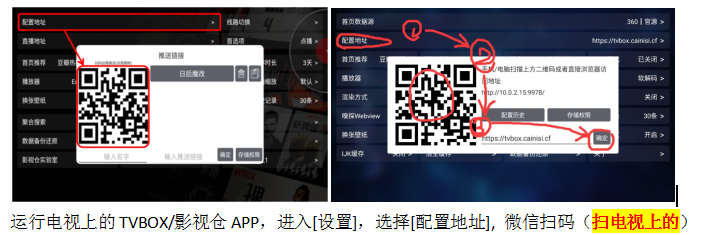 1、运行电视上的TVBOX/影视仓APP,进入[设置],选择[配置地址], 微信扫码(扫电视上的)