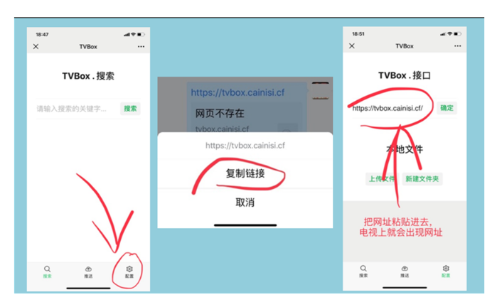 运行电视上的TVBOX/影视仓APP,进入[设置],选择[配置地址],手机微信扫码,出现配置界面,点下方的[齿轮]。出现[BOX/影视仓]接口界面,把配置网址粘贴上去,推送/确定。