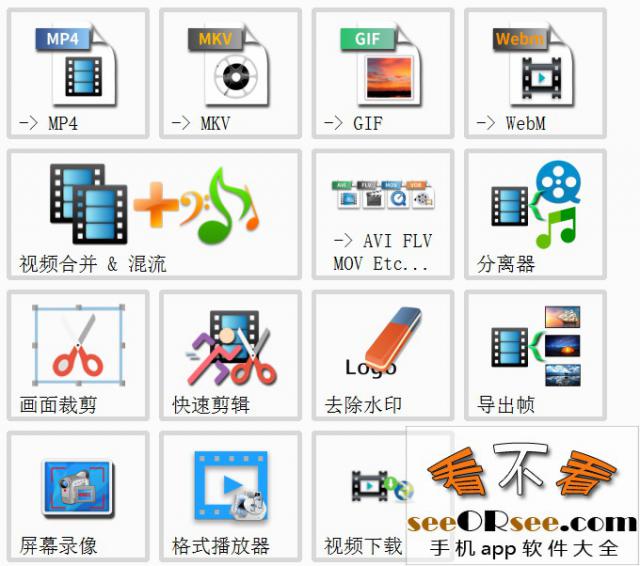 比如视频里包括MP4、MKV、GIF、WebM,还可以视频音频分离、画面裁剪、快速剪辑、去除水印、屏幕录像、视频下载等等15种功能。