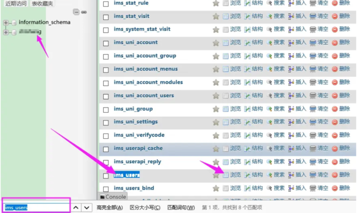 2,打开宝塔-点击数据库-点击phpmyadmin-点击对应的微擎网站-点击ims_users-进入用户名管理页面