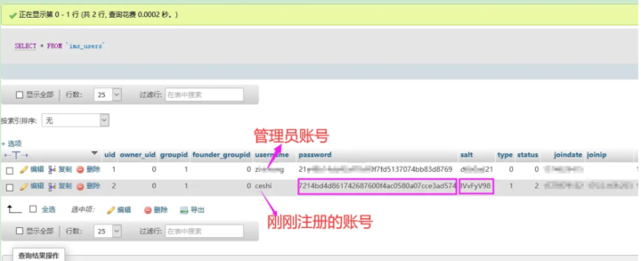 3,找到你刚刚注册的账号信息,复制你新注册会员的字段password和salt里面的内容到你的管理员账号里面,这样你就可以用刚刚设置的密码登陆你的管理员账号了。