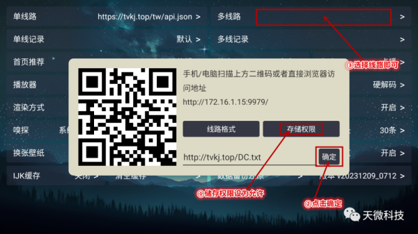 这款软件还支持多仓配置,我们打开设置点“多线路”然后吧“储存权限”设为允许,然后点击“确定”就可以在多线路选择线路使用了,多仓地址也为大家准备好了多仓地址:http://tvkj.top/DC.txt